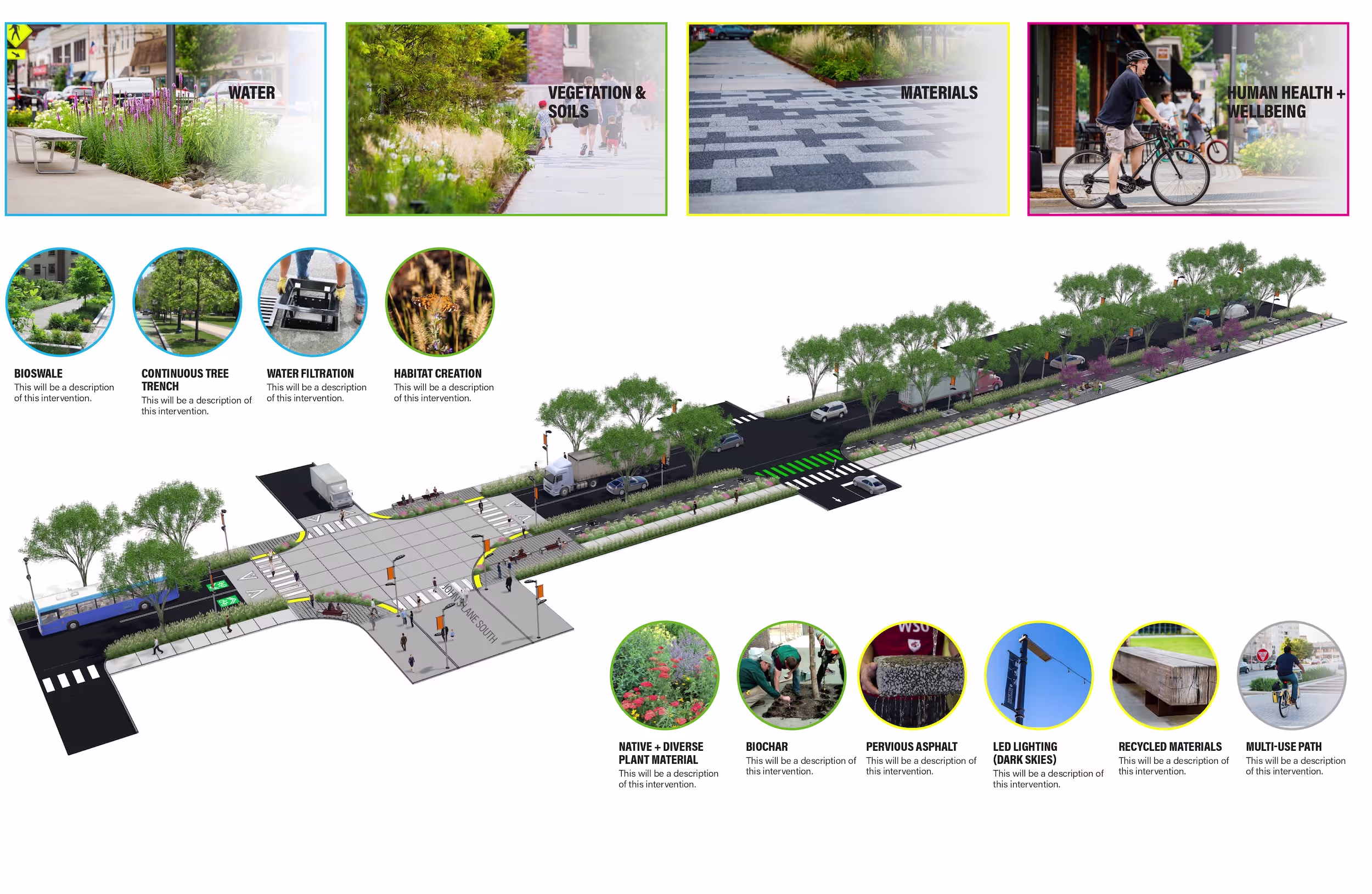 Grounded in a comprehensive analysis of circulation, stormwater behavior, and existing infrastructure, the design redefines Hackensack Avenue as both a Complete Street and a Green Street. A separated two-way cycle track and a pedestrian promenade now extend the full length of the corridor, offering safe, accessible connections between Kearny Point and nearby transit. Native plantings and bioswales capture and filter stormwater runoff while restoring ecological function to the urban landscape. Biochar-amended soils improve infiltration, support plant health, and sequester carbon—embedding resilience within the design’s very foundation.